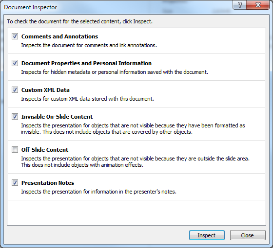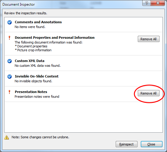 Usually I walked through all my slides and removed all the notes manually but that was BEFORE I knew this feature. I do not know if there is something like it in older versions but in PowerPoint 2010 you can easily remove all personal things from your presentation with a few clicks (also in Excel, Word etc.)