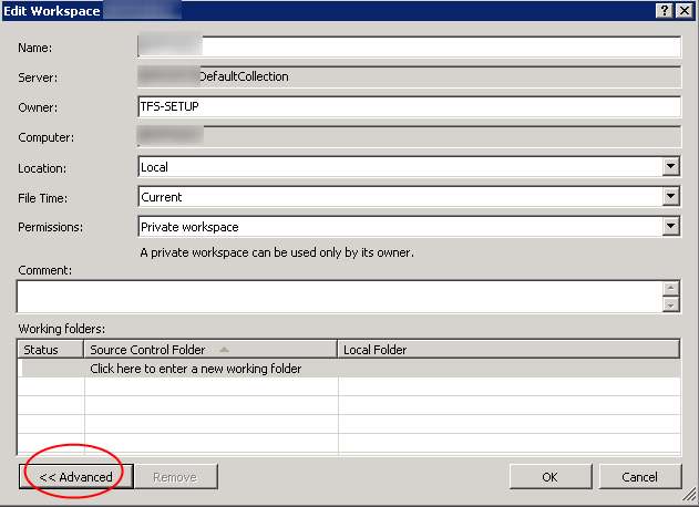 When creating a new workspace (and I explained why you need to do that in my previous post) or editing an existing one, the dialog pops up. In 2012 it shows a small one. Press the “Advanced” Button to expand.