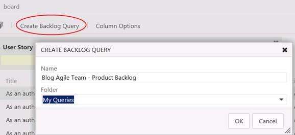 The most obvious option was to press the [Create Backlog Query] button on the Product Backlog, but that only gave the possibility to save the underlying query in the Team Project.