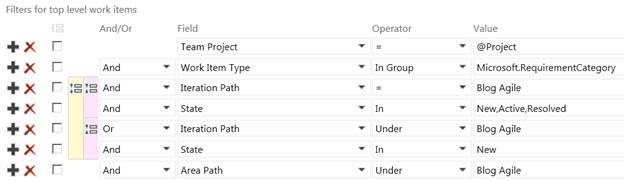 As we can see in the query for the Agile Template, the product backlog shows us all Work Items from the Requirements category in the states New, Active and Resolved.