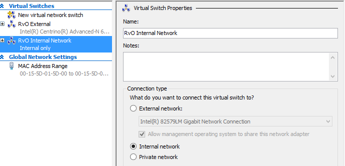Point the first network card to the virtual switch [My Internal Network]. If you like you can directly point the second network card to your external network, but you can change this when running the virtual machine as well.