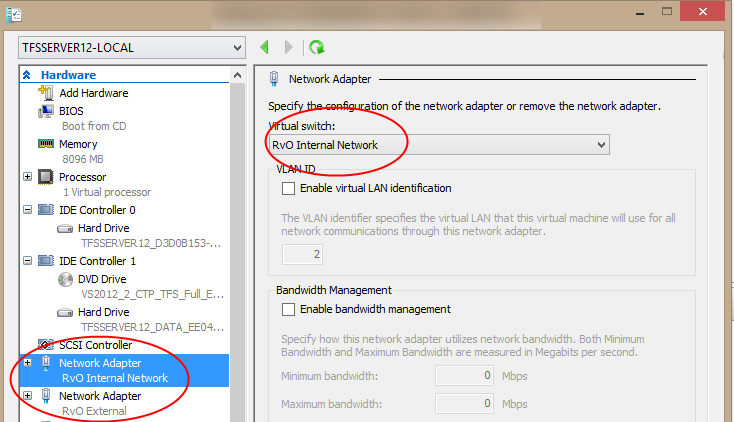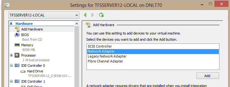 Now that I have this possibility, I run my TFS demo machine on my Hyper-V host. Because I copy-paste a lot between my host and TFS Machine, and want full screen demo’s, it is important for me to have the networking between the two working seamlessly.