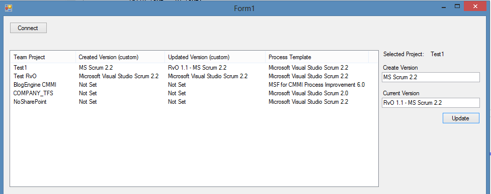 The program lets you connect to a Team Project Collection and select the Team Projects you would like to work on. Once you select the projects, the list fills up with Team Projects, the Created Version Custom Property, The Current Version Custom Property and the Process Template property which is default in all Process Templates of TFS 2012.