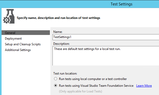 and selected [Run tests using Visual Studio Team Foundation Service]