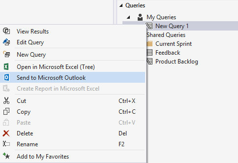 The same works for Work Item Query. Just right click the query in Team Explorer and choose send to Microsoft Outlook.