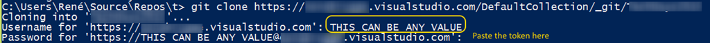 This token alone is sufficient to authenticate against VSO. So when you now clone a Git repository you only have to fill in this token in the password box. Username can be empty or any value