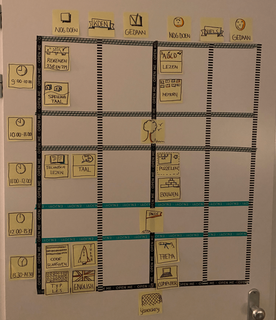 In these times, where we are cramped together at home the whole day, me time is also important. To accomodate in this, we created a very simple on/off board. You can take your name and move it to the “NOT HERE” column. That’s where we have agreed that you cannot be disturbed. Sleeping, headspacing, sports, or just time alone. All fine. Ths cards are respected