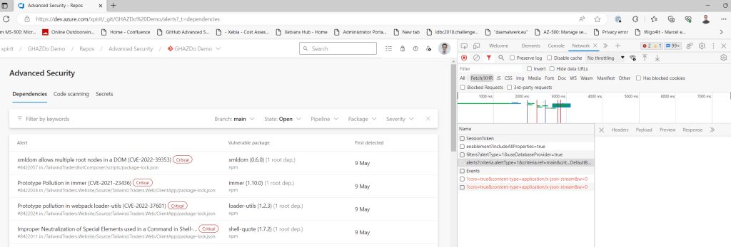 The powershell script needs to check the results of the dependency reviews. At this moment in time, the GHAZDO API’s are not yet documented, but the F12 developer tools are our friend. We can see which API’s are called.